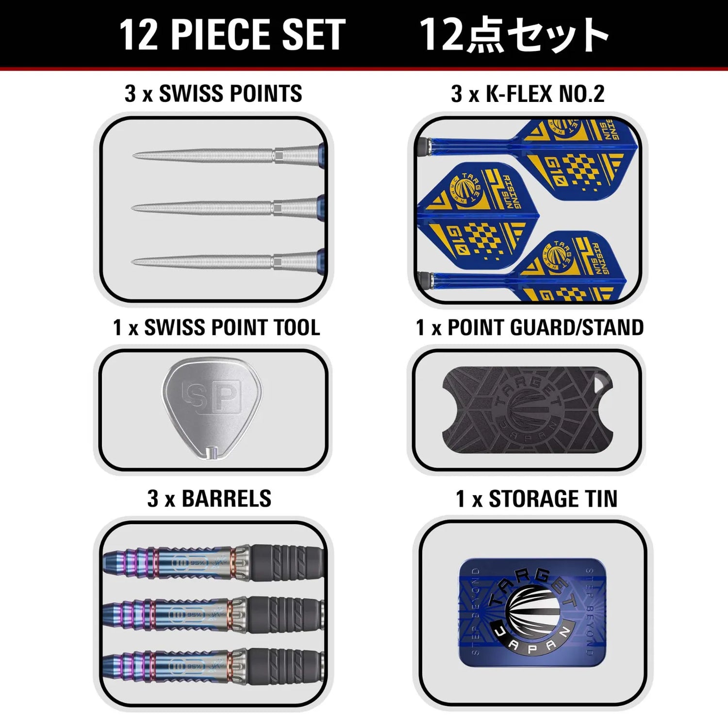 Each set is fitted with Target Swiss Storm Nano Points, featuring intricate nano grooves to enhance board grip and reduce bounce-outs. Designed with a flush-fit profile, Swiss Storm Points sit seamlessly within the barrel for a clean, streamlined feel. Target’s patented Swiss Point technology allows points to be changed quickly and effortlessly using the included Swiss Point tool.