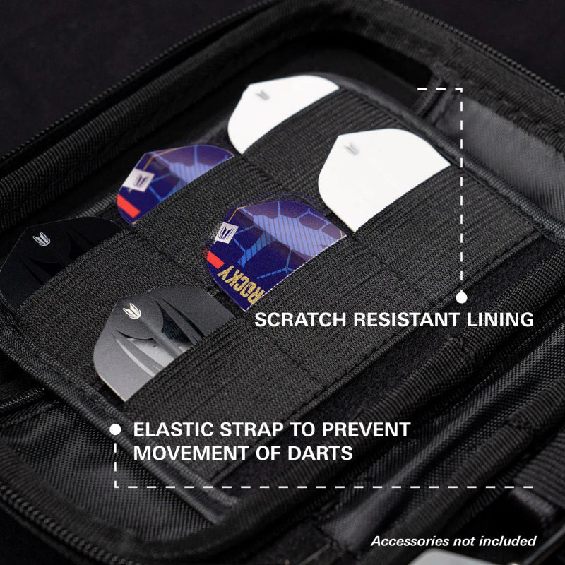 The wallet boasts efficient organization with two zip-locked pouch pockets, offering dedicated space for spare dart accessories such as flights, shafts, points, or a Swiss Point tool, making them easily accessible during intense games.
