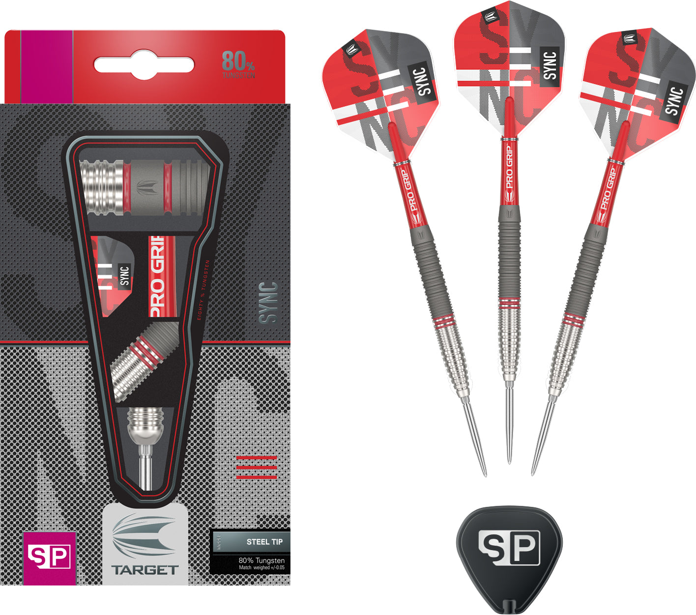 The darts are completed with a Red Pro Grip Shaft and exclusive Sync flight designs.