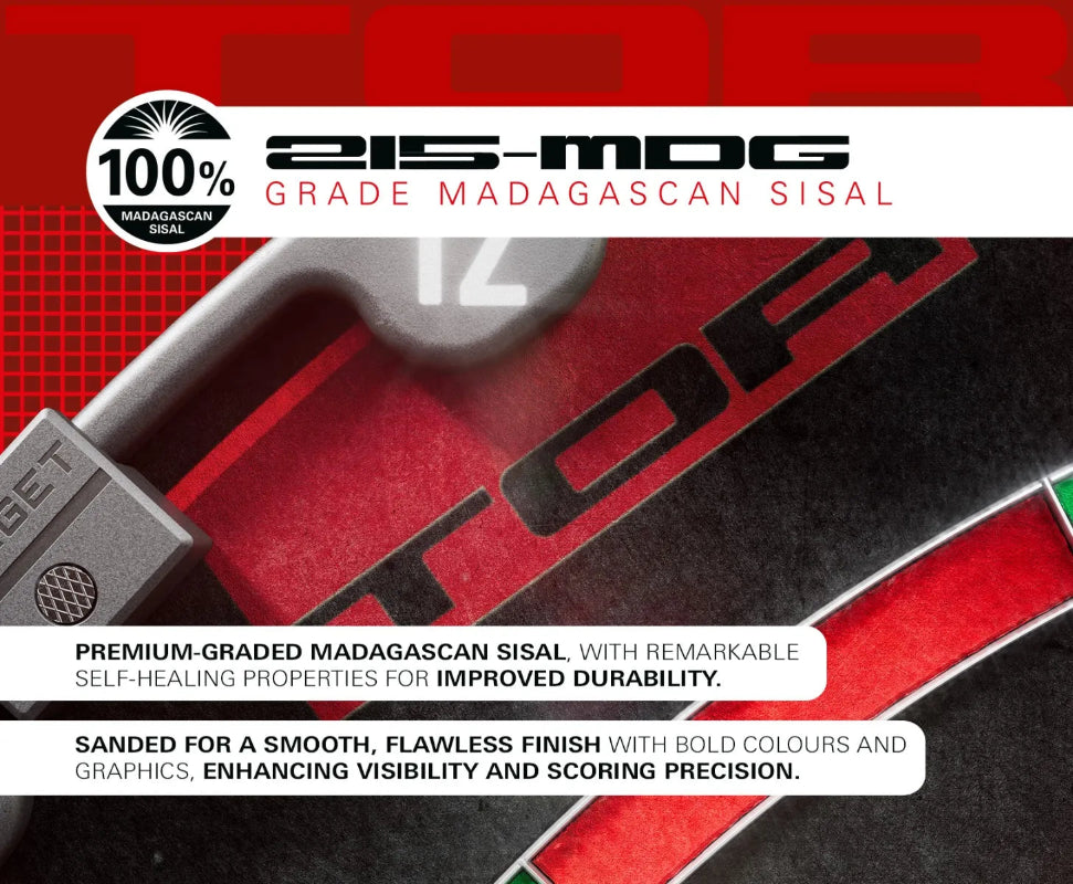 Constructed with 215-MDG premium Madagascan sisal, the board offers exceptional self-healing properties and dart retention, ensuring it remains in top condition through extensive play. Its sanded surface boasts a smooth, flawless finish with bold colours and graphics that enhance visibility and accuracy.