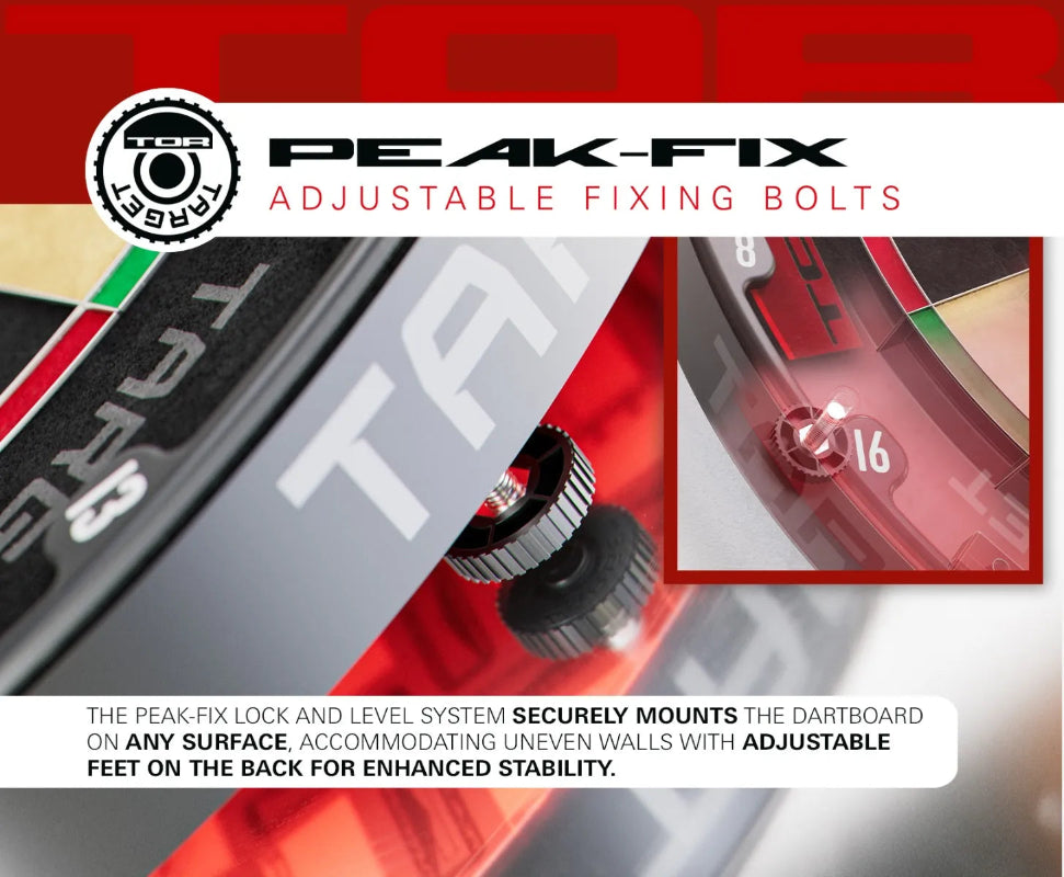 The durable stainless-steel low-profile wiring system reduces bounce outs, while the Peak-Fix lock and level system provides secure mounting on any surface, even uneven walls, thanks to adjustable feet.